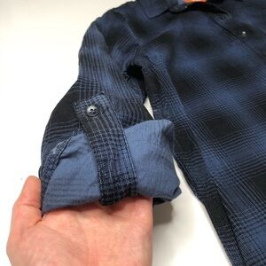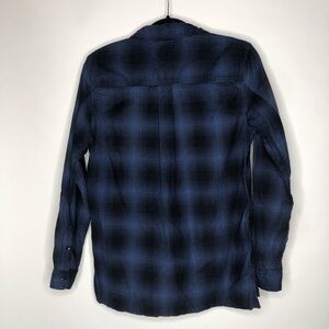 Joe Fresh black and blue plaid button up shirt in a soft micro corduroy material. The long sleeves can be rolled up and buttoned for a relaxed casual fit. The back hem of the shirt is longer than the front and the style overall is boxy with small detail slits on the side. There is one pocket on the front. In excellent used condition with no flaws. Please see photos for measurements and details. Women’s size MEDIUM.