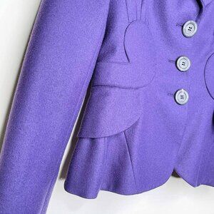 This stunning piece of history from John Galliano features intricate swirls in a tailored silhouette that elevates your curves. Ruched pintucks on the chest add dimension in an overall felted wool suit. From the early 2000's runway, and it's giving me all the Elle Woods vibes I need right now. Shell: 96% wool 3% nylon 1% elastane Lining: 96% silk 4% elastane