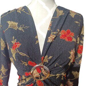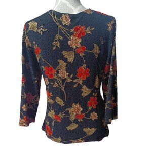 Luxuious look with textured black fabric, gold leaves and red flowers outlined with gold. Nice. Note the pit to pit measurement may not be an accurate measurement of size due to the front gathers.