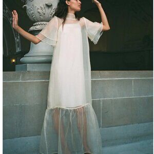 Maxi length dress constructed from silk organza. Exaggerated ruffle hem, tiered sleeve, mock neck with fabric covered buttons at back. Slip sold separately.