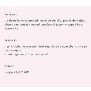 set includes: mousepad, desk sign, large binder clip, click pen, and notepad