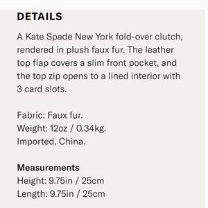 a kate spade fold-over clutch, rendered in pink plush faux fur. The leather top flap covers a slim front pocket, and the top zips opens to a lined interior with 3 card slots.