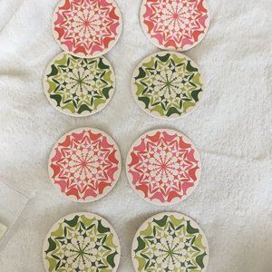 each pack comes with a total of 8 coasters: 4 in a redish pink and 4 in a greenish pattern resembling a snowflake or christmas ornament!