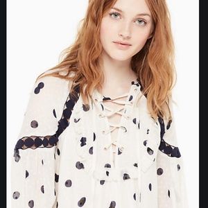 Our love for polka dots is no secret. Our dee dot billie top has them in spades and is crafted from layers of super soft silk, then finished with luxurious trim and detail. 100% silk long sleeves tie neck dot embroidery relaxed fit size s measures 27" long from highest shoulder point