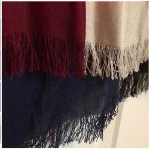never ended up wearing it! no tags beautiful colour and lightweight. pink black white colorblock pattern with fringes. 100% viscose.