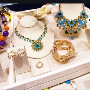 Rich color bursts forth from a gorgeous, handcrafted pendant paired with a jewel-encrusted chain. gorgeous blue teal green yellow and gold statement necklace--- you will get so many compliments wearing this!