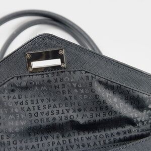 Zippered pocket features classic black leather placard with iconic kate spade New York stamped in gold.