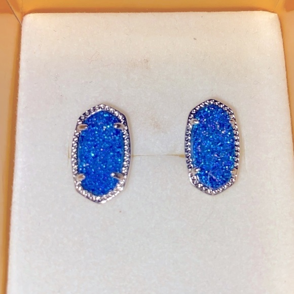 BNWOT Kendra Scott Ellie Silver Tone Stud Earrings In Blue Drusy Druzy