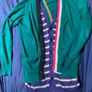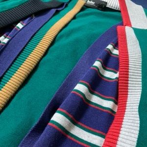 This is a standard docking cardigan that has been developed by kolor for the past few seasons. A blue and white striped cardigan is docked inside a green cardigan, and a knit collar is docked on both sides.