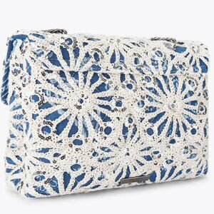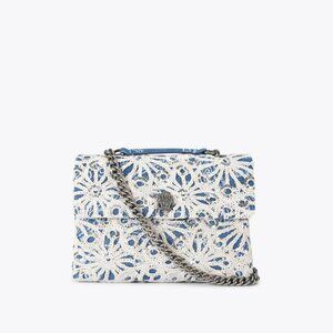 The Large Kensington Soft purse is crafted from a paisley printed denim with cut out bone embroidery. The antiqued silver eagle head features crystals and black bead eyes on the front flap.