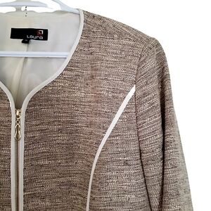 LAURA short jacket lenin blend nice cute, very classy, long sleeve, lined, nice structure, looks brand new. Wrote a 14 but check measures.