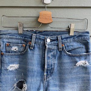 size 27 in Levi's Blue, well loved. designed with a special construction to lift and flatter your backside. please note there is some extra distressing from wear (including butt cheeks). button fly with tapered leg. style code pc9-22861-0024