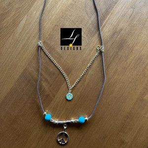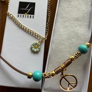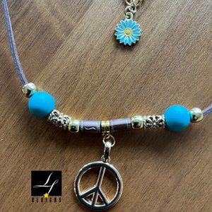 NWT: This lovely boho leather necklace is aptly called SunFlower CenterPeace for its unique placement of a solitary peace symbol surrounded by wooden turquoise beads and book ended with gold beads. A solitary sunflower adorns your neck hanging by a pretty gold plated chain.