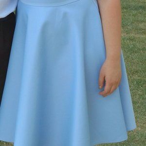 A beautiful baby blue, slightly longer than knee length dress. It's made of really stiff (but SUPER comfortable) material so it really holds its shape. Comes in at the waits and then really poufs out so it's super flattering. I bought it in Europe a couple years ago for a wedding where honestly there was barely any partying so it's in perfect condition. It's been sadly sitting in my closet in the hopes that I'll fit into it again......