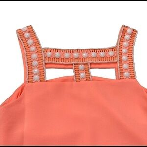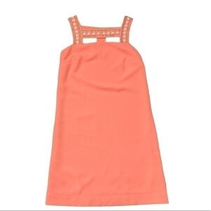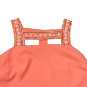 Such a beautiful piece from Lilly Pulitzer! Bright neon peach pastel shift dress in a mini length. About 33” from the shoulder strap to the hem. Interesting cutout neckline with white and gold beads, the back and front are slightly different. Bust measures about 31”