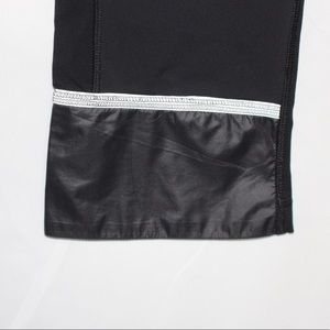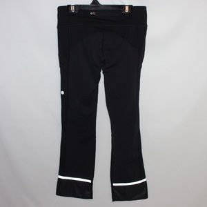 Lululemon black flare pants with zipper closure pockets and reflective trim. It has windbreaker material at the ankles and is in like new condition with a size dot confirming size 6!