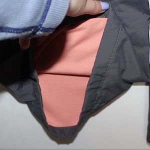Grey windbreaker Lululemon wide leg pants with pink fleece lining in like new condition! It has pockets and a stretchy waistband. The drawstring and the size dot are missing but the measurements are consistent with a size 4/6, the waistband it stretchy.