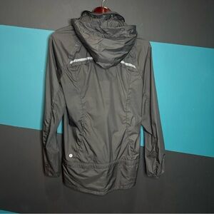 Black jacket with half-zip front. Features practical pockets. Perfect for everyday wear. Wind proof and reflective