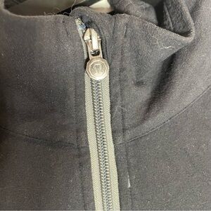 Stylish zip-up sweater. Features black body with gray accents. Perfect for casual wear.