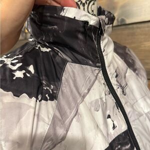 Stylish lululemon jacket with a high collar. Features a black and white abstract pattern. Perfect for layering. Zipper away hood.