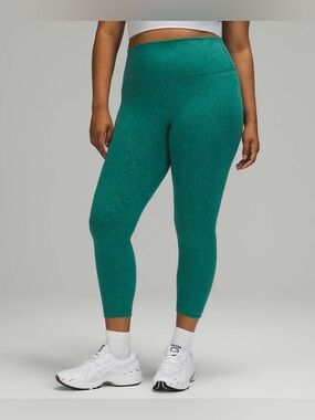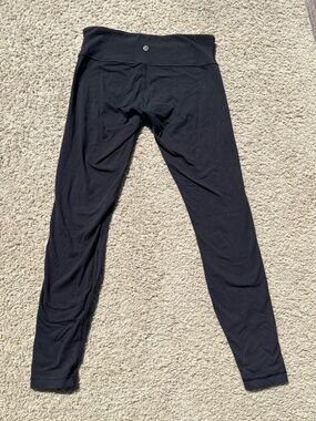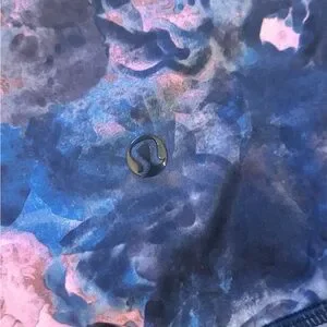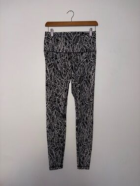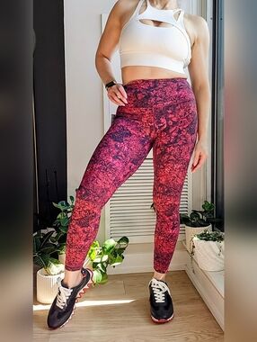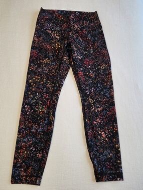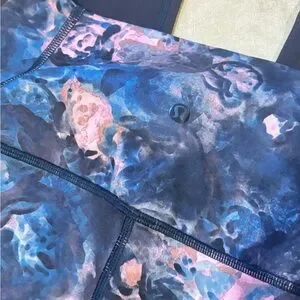 High-rise patterned leggings from lululemon. Navy panels with printed blue and pink swirl design. Breathable fabric with mesh inset. Flattering seam lines and ankle length. Versatile for workouts or casual wear.