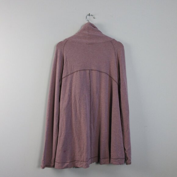 Stylish pink cardigan from lululemon athletica. Features a cozy design with a draped collar and drawstrings.