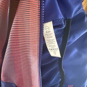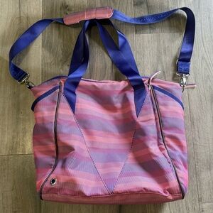 Stylish pink and blue bag. Features dual handles and adjustable strap. Perfect for everyday use.