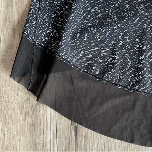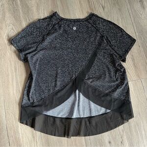 Stylish speckled top with a sheer hem. Perfect for casual wear or workouts.