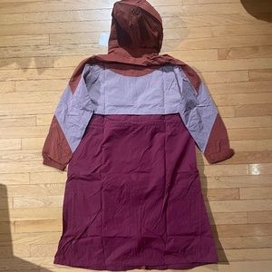 Stylish trench coat with a hood. Features a mix of burgundy and mauve colors. Perfect for layering.
