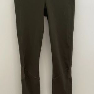 These are the cropped lululemon leggings in forest green! They are mid rise and are 91% Nylon and 9% Elastane. They are a size 4 in the hug feeling.