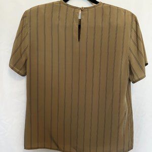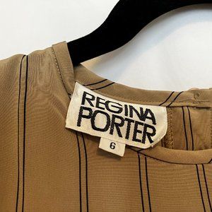 Regina Porter coffee colored, double black pinstriped blouse, size 6, polyester, all seams sewn with cotton, with small shoulder pad,