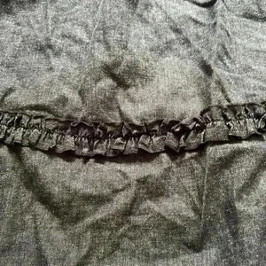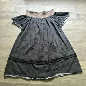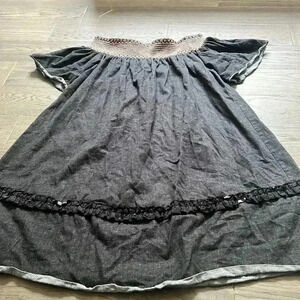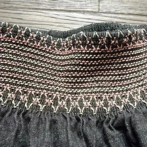 This dress is absolutely beautiful. Is kind of like a light black jean wash and is off the shoulders. Has beautiful pink embroidery on the top. Perfect for fall with a pair of knee high boots.