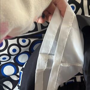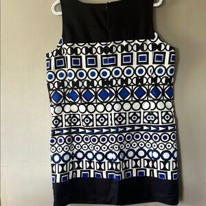 This elegant sleeveless sheath dress by mark. features a striking black and white geometric pattern. Designed with a crew neck and a mini length, it's perfect for casual or work settings. The dress's sleek silhouette and bold design make it a standout piece for any wardrobe.