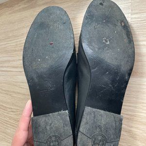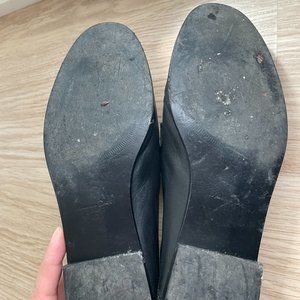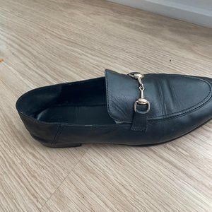 classic black leather loafers with gold buckle in good condition