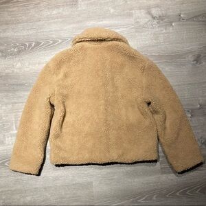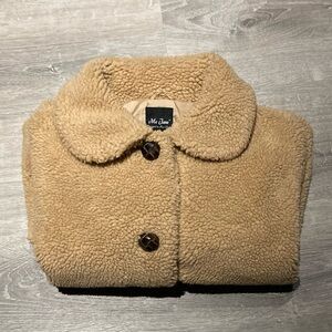 This is a beautiful warm and fuzzy teddy bear Sherpa Jacket. It has really nice large chunky leather looking buttons. Completely lined throughout including sleeves. It is in excellent pre-owned condition!