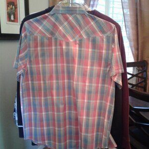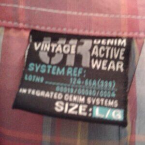 used men's UR Vintage Denim Activewear shirt. Short sleeve. Blue and red plaid. Size large.