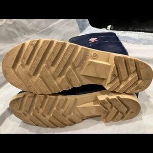 AI description Stylish navy blue rain boots featuring durable beige soles. Ideal for rainy days. Might be appropriate for boating as well not sure.