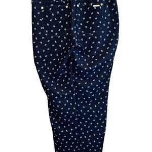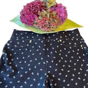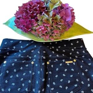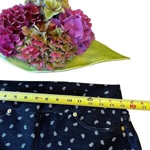 In great pre-owned condition, black with white paisley pattern, false front pockets and false zipper. Bracket pockets with gold logo bracket. Size medium with stretch, see measurements.