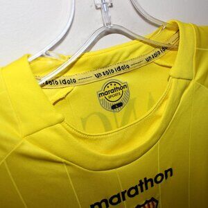 100% official licensed BARCELONA SC 2009 home shirt, featuring the commercial sponsors Pilsener, Banco Pichincha and Telmex. Manufactured by Marathon in very tight-fitting size Men's L - I measured only 19" from armpit to armpit across the chest at the widest part and 29" from top of shoulder to front hem. Vintage original. No time for Far East fakes or modern reproduction bollocks. This is the real deal.