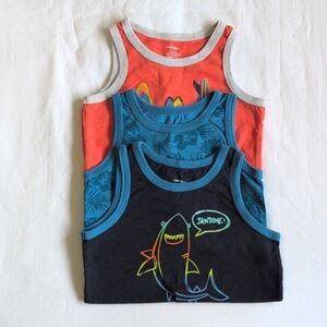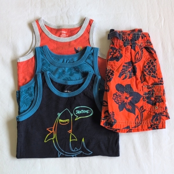 mixed brands 4 piece coordinating summer beach bundle lot - 3x george graphic tank tops & oshkosh b'gosh hawaiian floral cargo shorts, all 100% cotton, 18-24 months/2T baby toddler boys