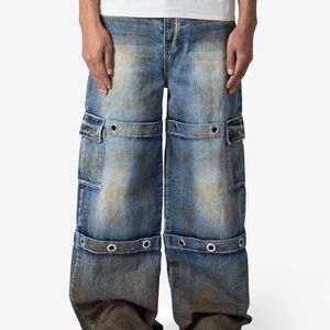 the Void Baggy Ring Denim is a bold addition to our collection. Featuring our latest Void fit with extra room in the waist, hip, and leg opening, along with an extended inseam from our Rave Fit. Constructed from a medium washed blue cotton denim with rust stains throughout, embracing traditional 5 pocket denim details, metal eyelet details on the legs, oversized cargo pockets at the outseam, and finished with a poly coating throughout for a sheen on the fabric.