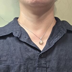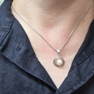 This elegant silver pendant features a beautiful pearl at its center, perfect for adding a touch of sophistication to any outfit.