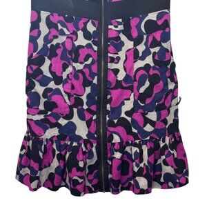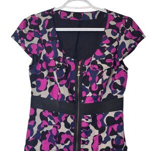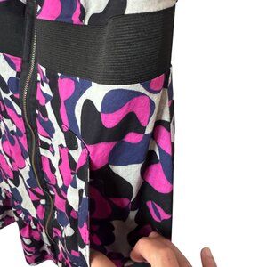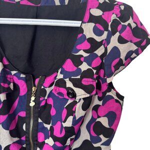 A short-sleeved, short-length dress with a colorful abstract pattern. Has an abstract pattern in shades of fuchsia, blue, and and white. Features a scoop neckline with a black trim and two decorative buttoned pockets on the chest. A black fabric band cinches the waist. A full-length, exposed zipper runs down the center front of the dress. The style is casual and can be worn for various occasions.