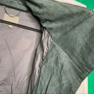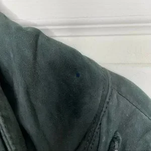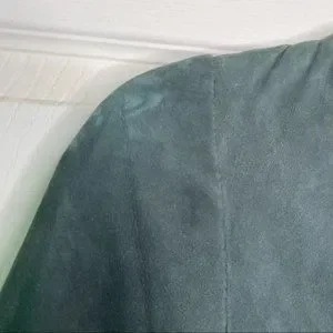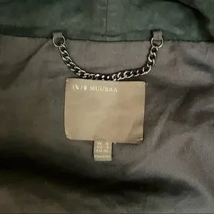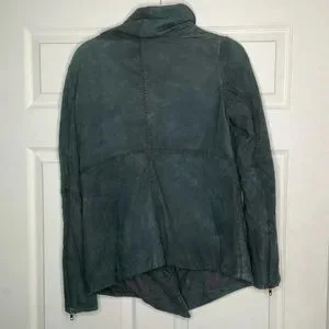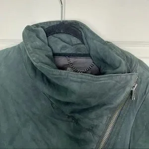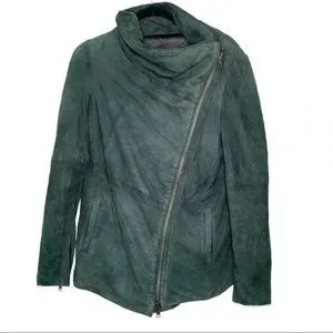 muubaa suede asymmetrical zip up moto jacket. greyish green. good condition but has some wear (see photos). relaxed fit, slight cowl neck.