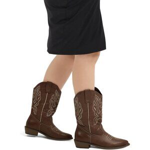 mysoft Women's Brown Western Cowboy Boots Mid Calf Pointed Toe Cowgirl