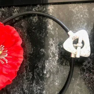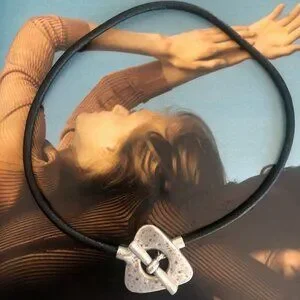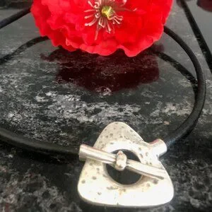 Necklace crafted with a claytoned leather belt-stripe strap, secured at the front with a silver plated toggle clasp.