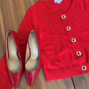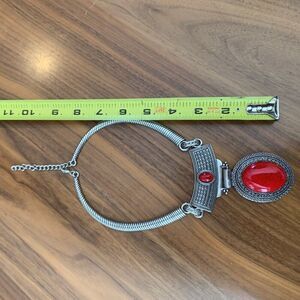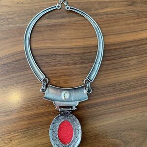Dramatic and strong. Choker style necklace with large red faux coral central stone in intricately worked and detailed antique silver look setting. Fashion jewellery in excellent used condition with no damage or wear detected. On trend native, African, boho, influence with strong geometric details. So versatile, wear with jeans, dress or dress pant, sweater and or your favourite jacket. 3 inch extender chain with lobster claw closure to ensure fit and allow for some adjustment for different necklines. Easy to build an exciting new ensemble around, see suggestions shown (all items listed and priced separately in Our Closet). Treat yourself to something new, exciting AND thrifty! See what's Fresh from Lemon Squeezy Shop🍋