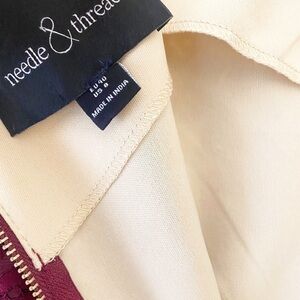 Beautiful lace overlay Dress by Needle & Thread. Size 8. Nude sheath lining underneath with a burgundy/maroon lace overtop. Features a fluttery bell cuff and exposed gold zipper down the back. Stunning on and SO flattering. Has some stretch.