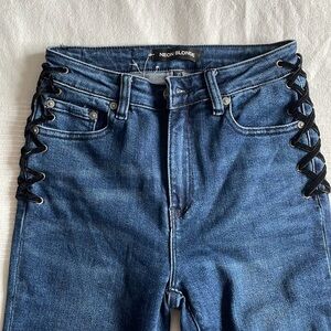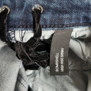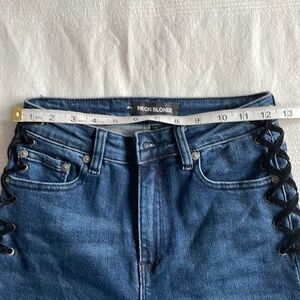 These Neon Blonde Lace Up Bombshell High Rise Skinny Jeans are in very good, pre-owned condition. Classic skinny jeans with fun, edgy black lace-up detail. Size 25 - please see pics for approximate measurements.