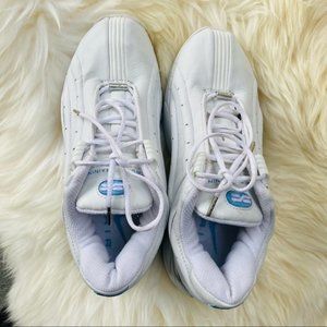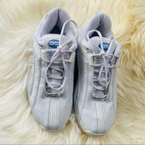 Brand new white Nike running shoes / sneakers / tennis shoes in size 7.5. Cute mega detail on shoes laces has Nike logo! Leather.